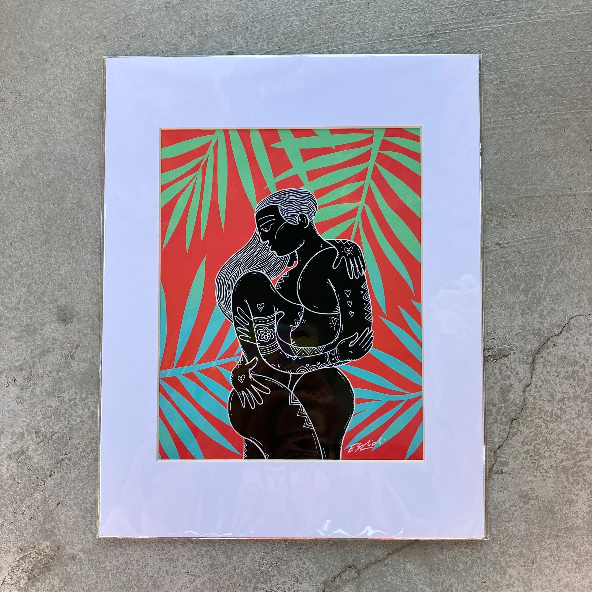Romantic tropical image of man and woman entwined, using acrylic and Posca on wood by popular Hawaii artist Eduardo Bolioli (14″ x 11″).