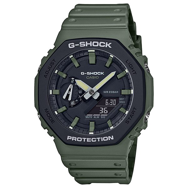 究極の強さを求めて進化を続けるタフネスウオッチG-SHOCKの薄型デジタル・アナログコンビネーションモデルGA-2100から、ユーティリティカラーを纏ったモデルです。 実用的でストリートファッションにも馴染みやすいユーティリティカラーをベゼル・文字板・バンドに採用。様々なウェアや環境にマッチしながらも、さりげなく個性を主張するデザインに仕上げました。 また、二重成形のベゼルカバーを採用し、デザイン進化を果たしました。 薄型ケースとデザインが融合したG-SHOCKです。
