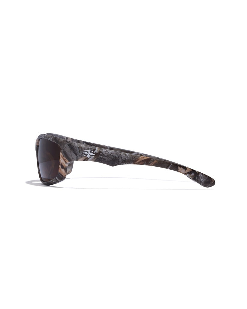 クラシックなハンティングカモフラージュカラーと温かみのあるブラウンの偏光レンズ